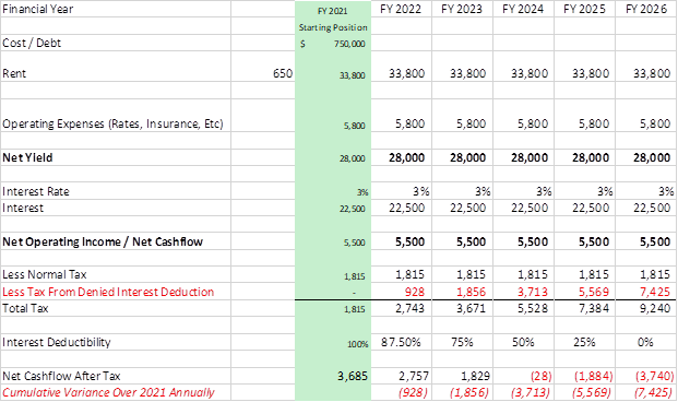 Have a look at the table below which shows how these changes will affect an investor as they are phased in over four years. In this example, the investor has a $750k property, with $750k of debt at an interest rate of 3%.
