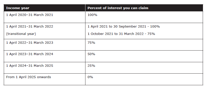 For second hand properties acquired prior to 27 March 2021 your ability to claim interest will be phased out over the next four income years, so that from 1 April 2025 there will be no ability to claim any interest as a deductible expense against residential rental income. The phase-in period over four years sees interest become progressively less deductible over each financial year as depicted in the following grid: